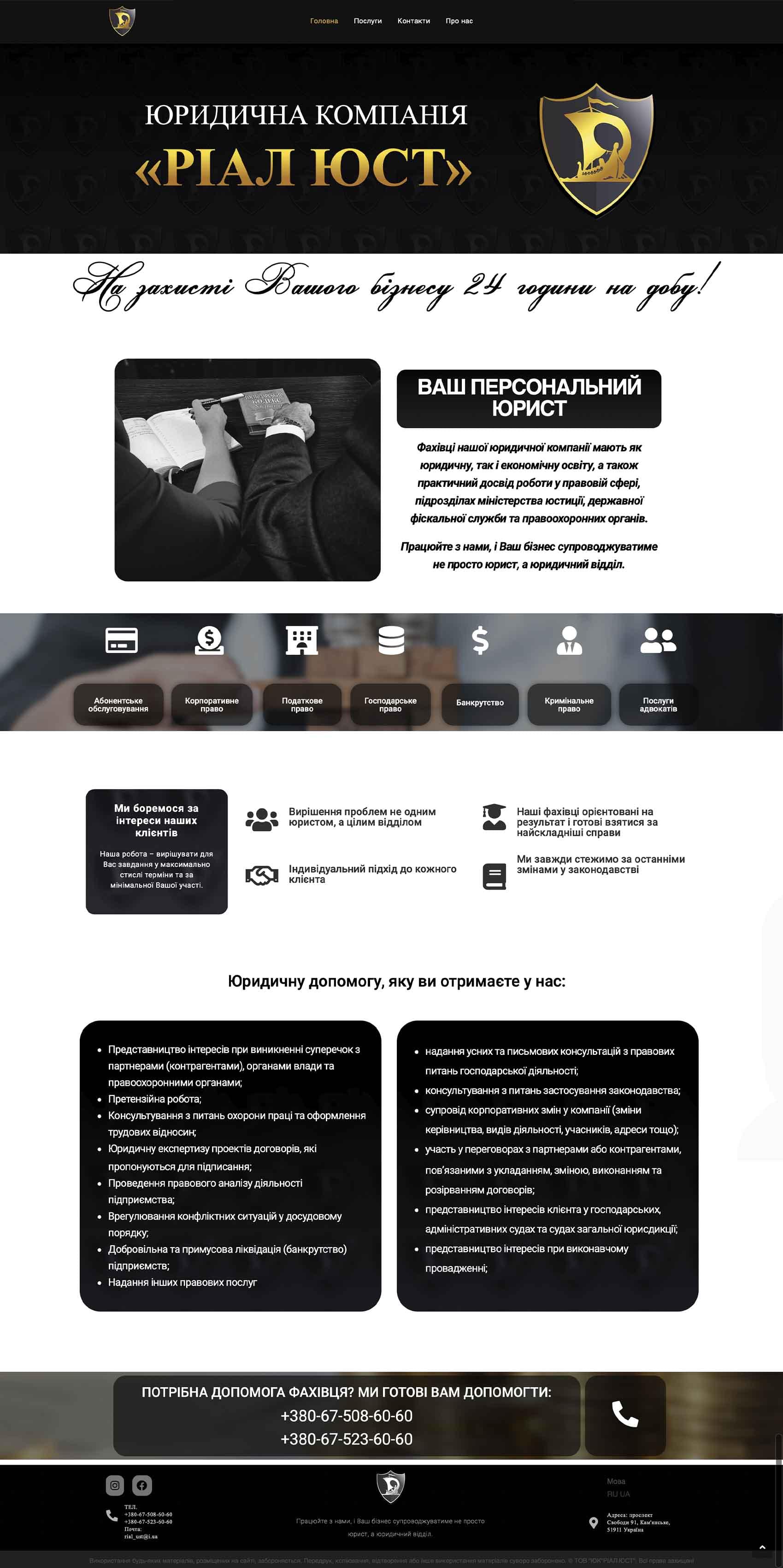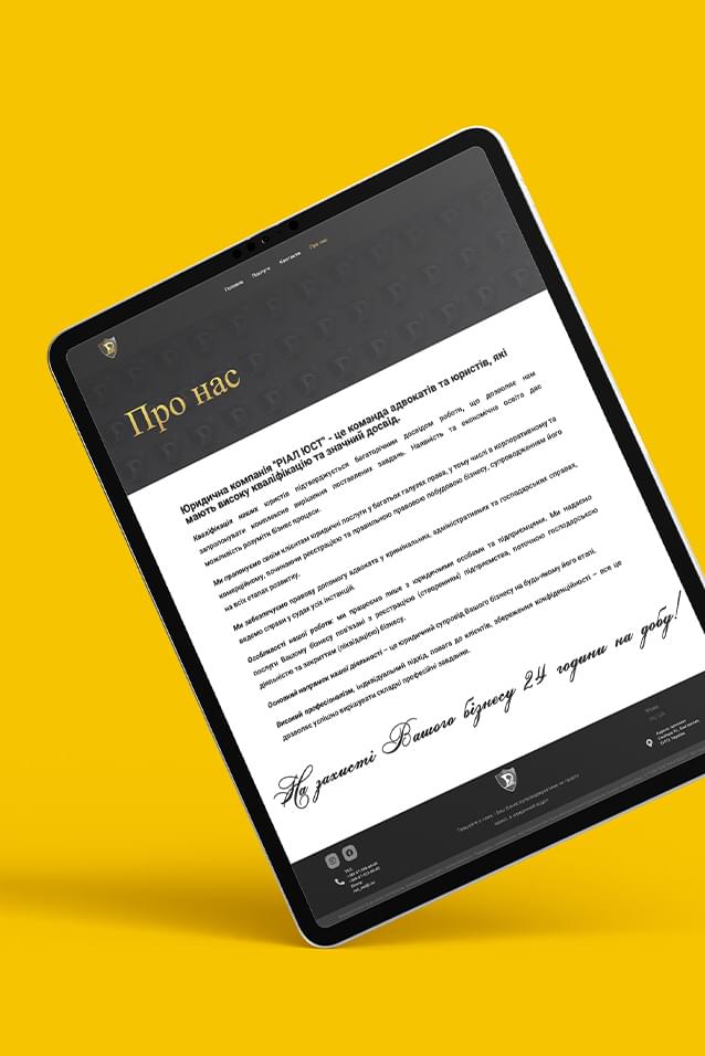 "Rial ust" is an elaborate design layout and website created for a reputable law agency. The website serves as an excellent platform to showcase the agency's extensive capabilities and wide range of services. It contains a detailed description of these services and firm guarantees of the firm, ensuring transparency and reliability of interaction with clients. In addition, atrebuti-calendars, such as calendars, have been designed to increase brand recognition, strengthening Real Ust's position in the legal services market.