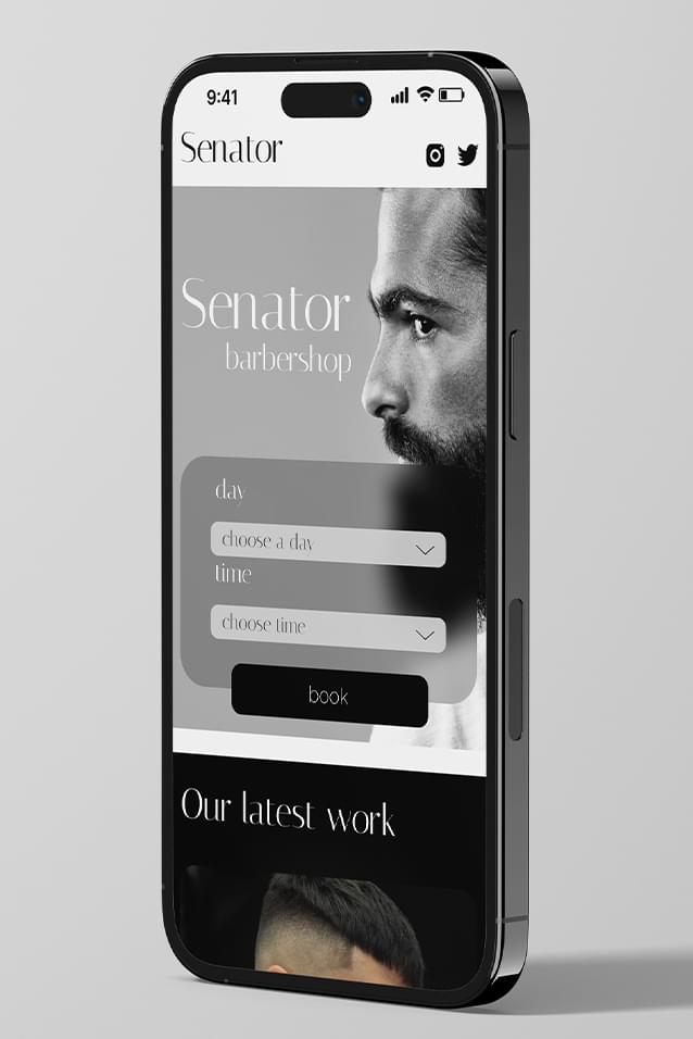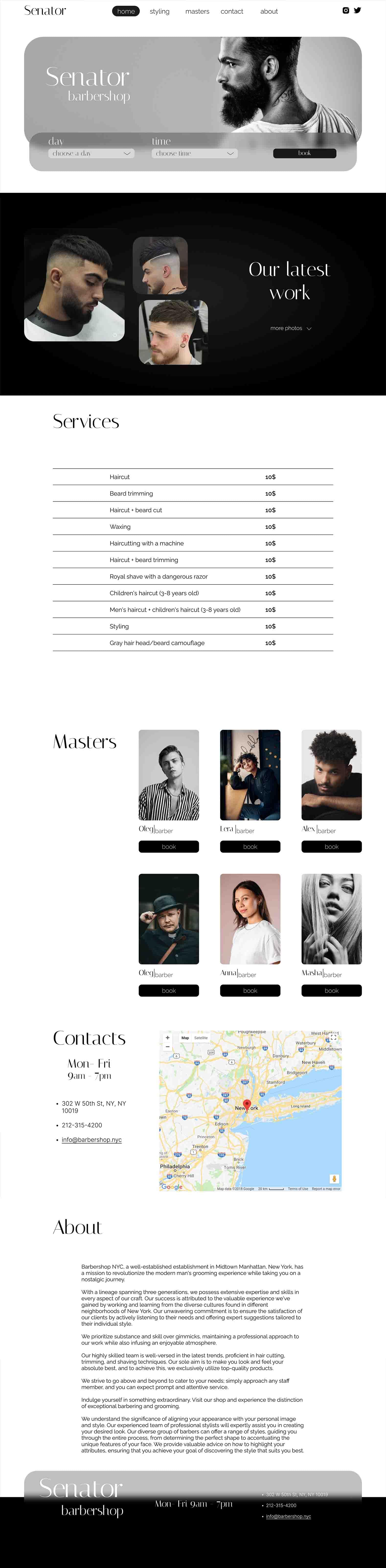 "Senator Barbershop" is a great web project dedicated to the barbershop. With its sleek and user-friendly interface, this website aims to provide a seamless and convenient platform for booking barber services. Emphasizing the artistry and skill of its barbers, "Senator Barbershop" showcases an impressive gallery of their outstanding work, allowing visitors to appreciate their talent and attention to detail. The platform's intuitive booking system creates a hassle-free experience, enabling customers to easily schedule appointments and select their preferred services. Through its visually captivating design and impressive functionality, "Senator Barbershop" serves as a captivating showcase of the modern barbershop experience.